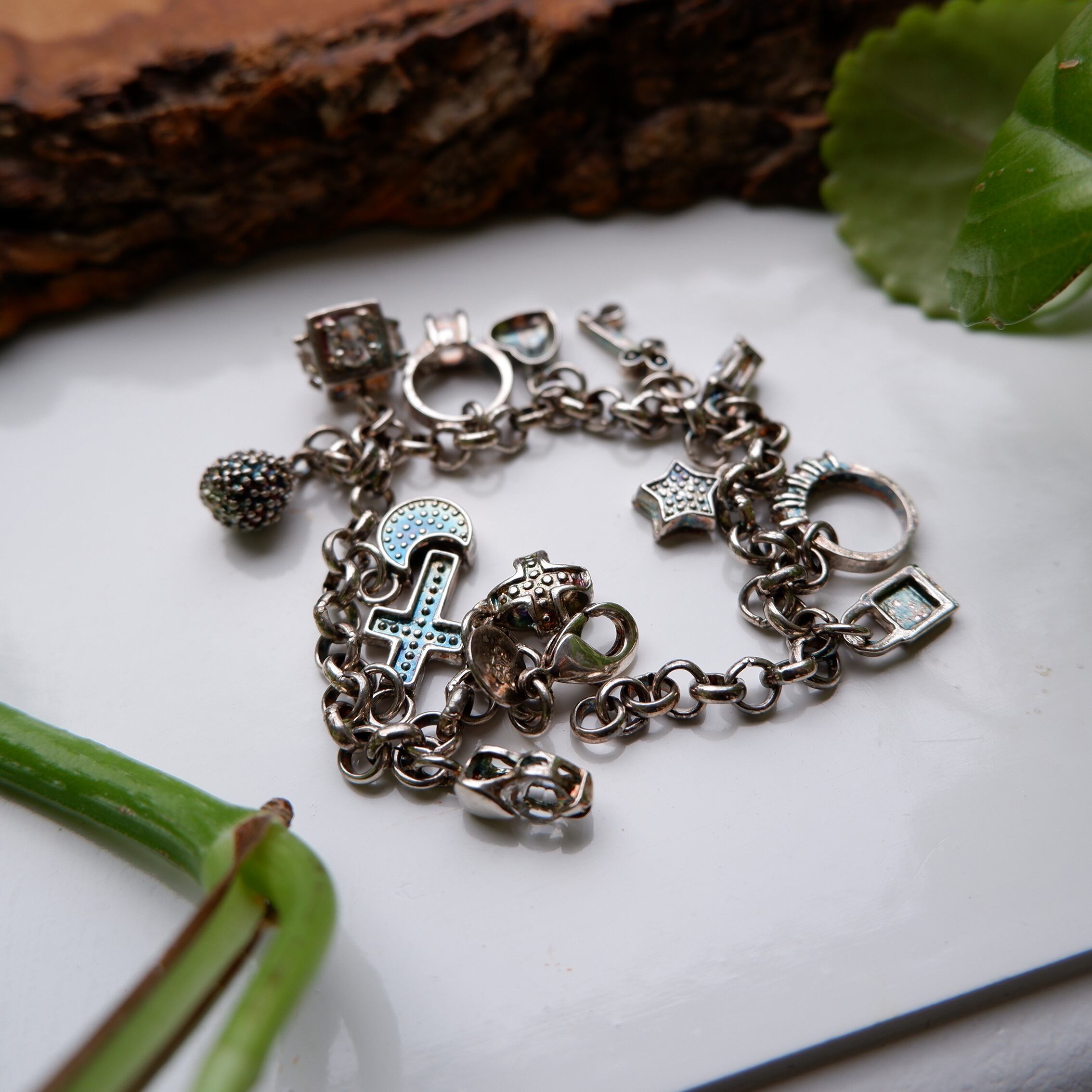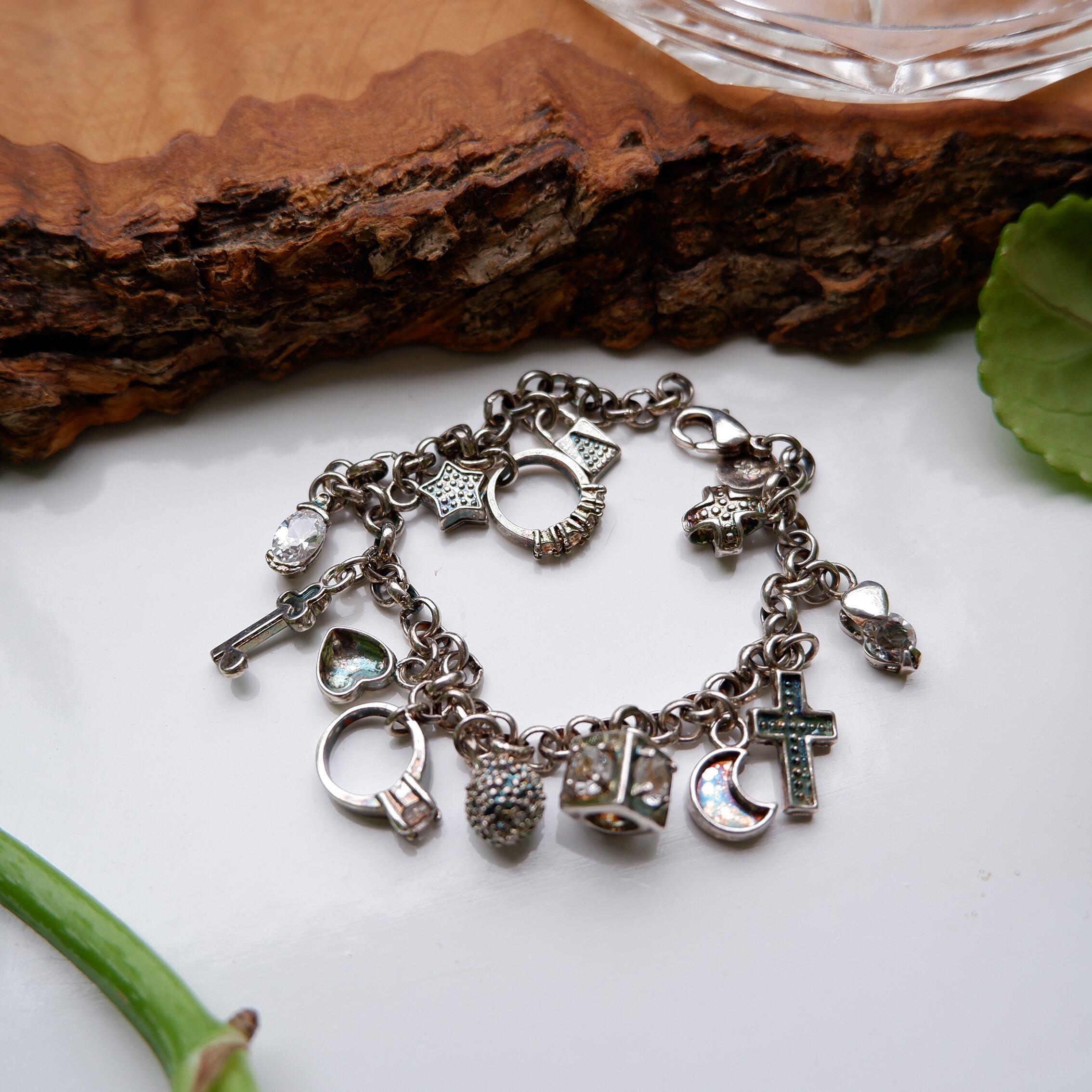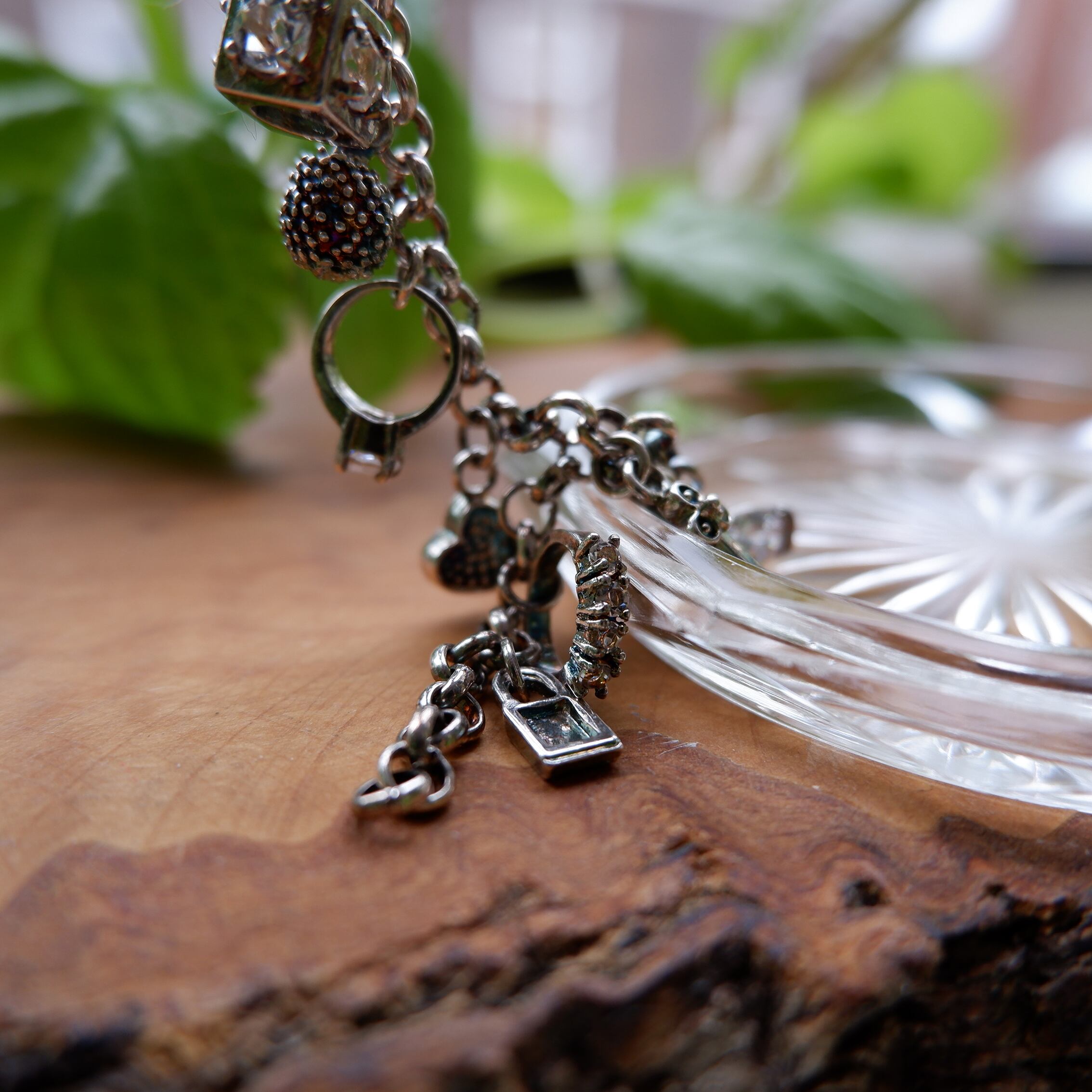 三つ葉のクローバーの形をした鍵モチーフや、三日月、星、クロスモチーフ・・などなど、小さな宝物がふんだんにあてがわれた、とても愛らしい、贅沢な一品です。
