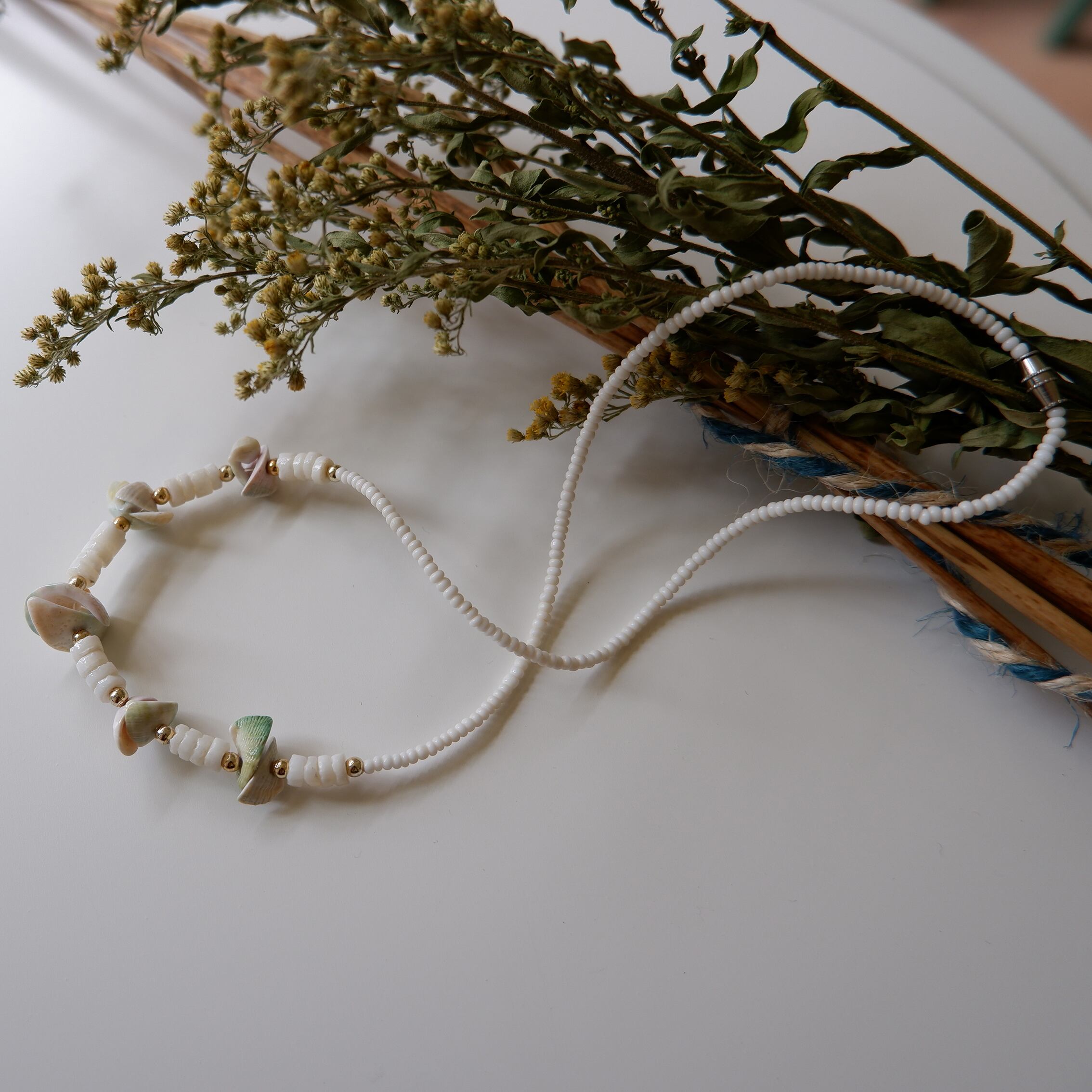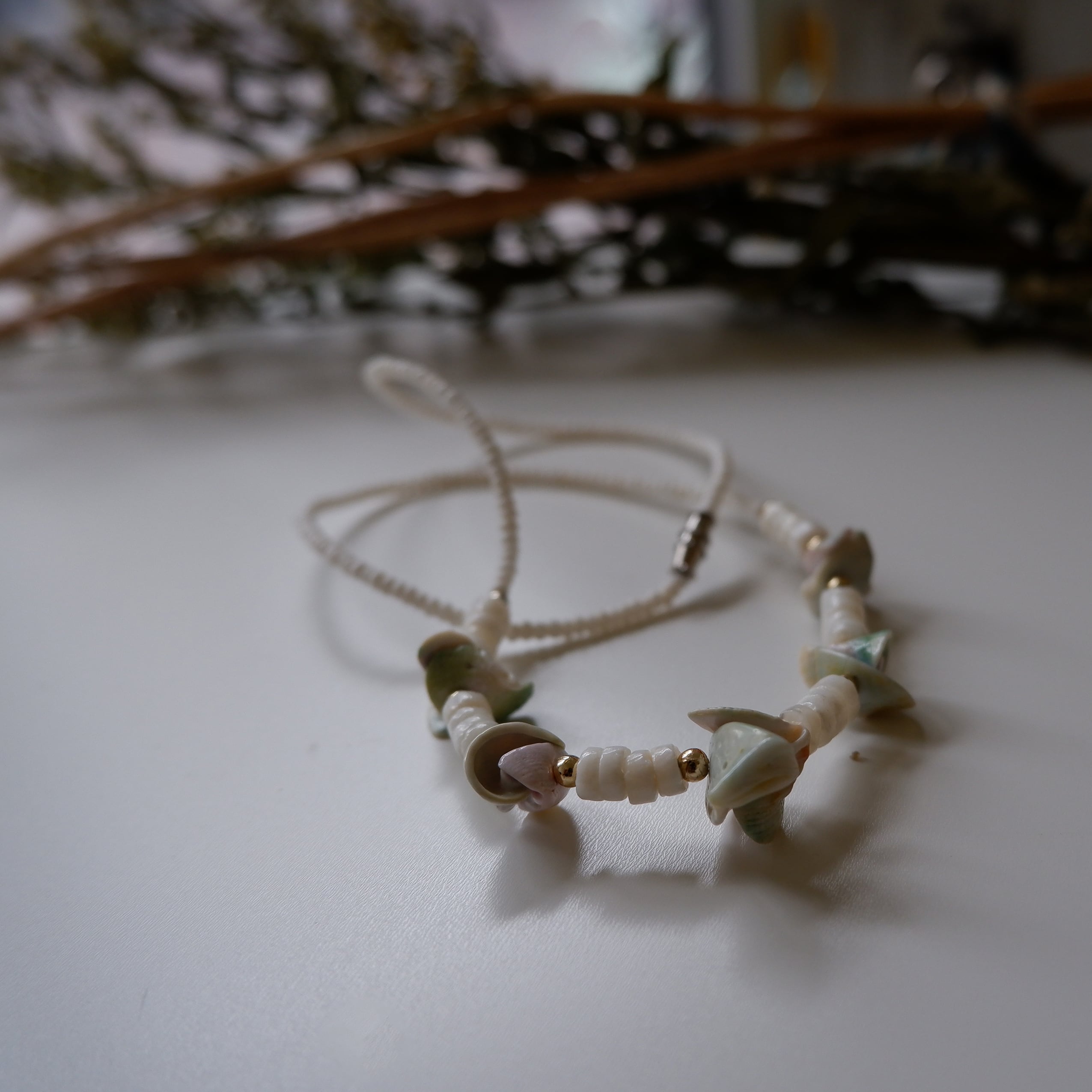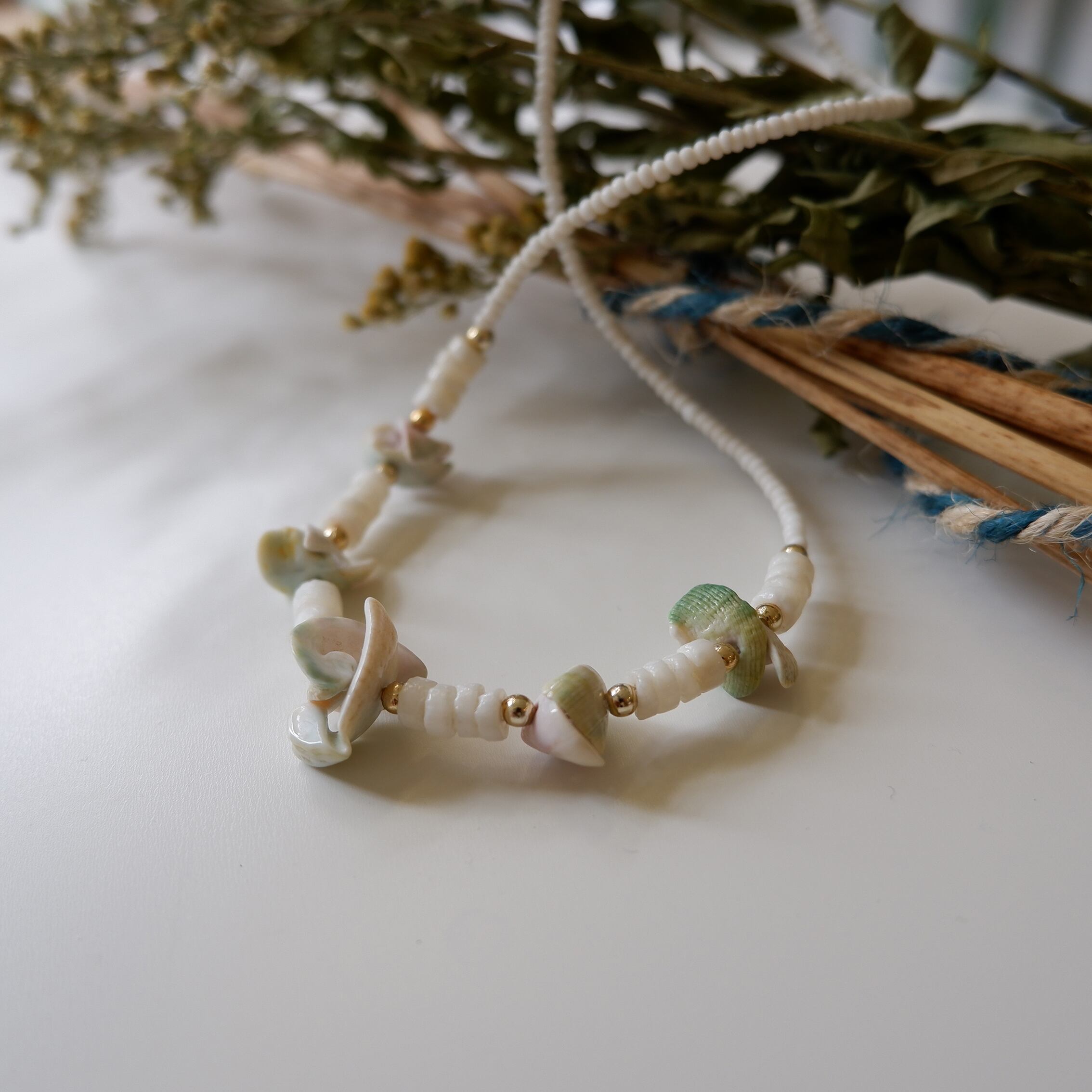 淡いエメラルドグリーンのアクセントが個性的な天然貝のネックレスです。
