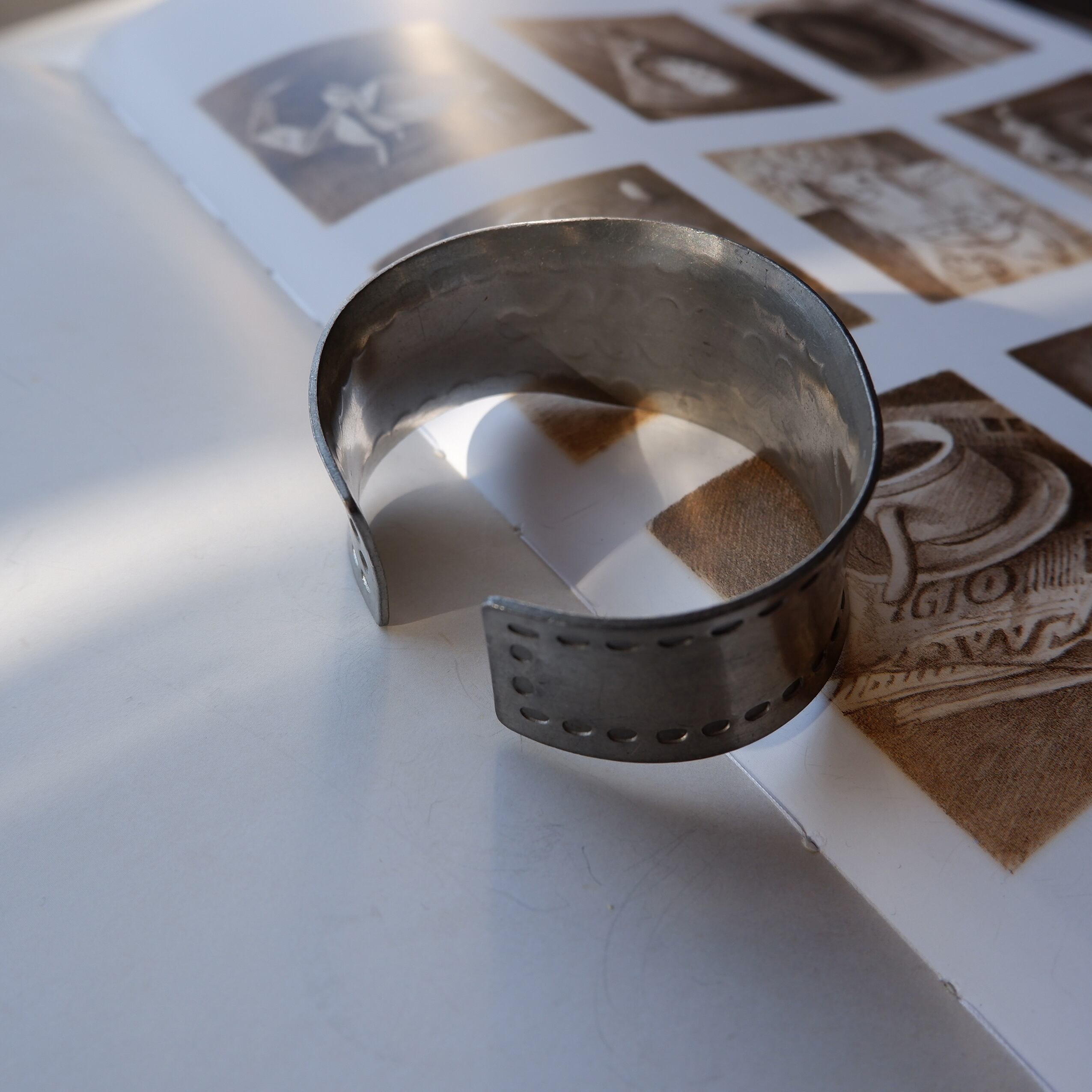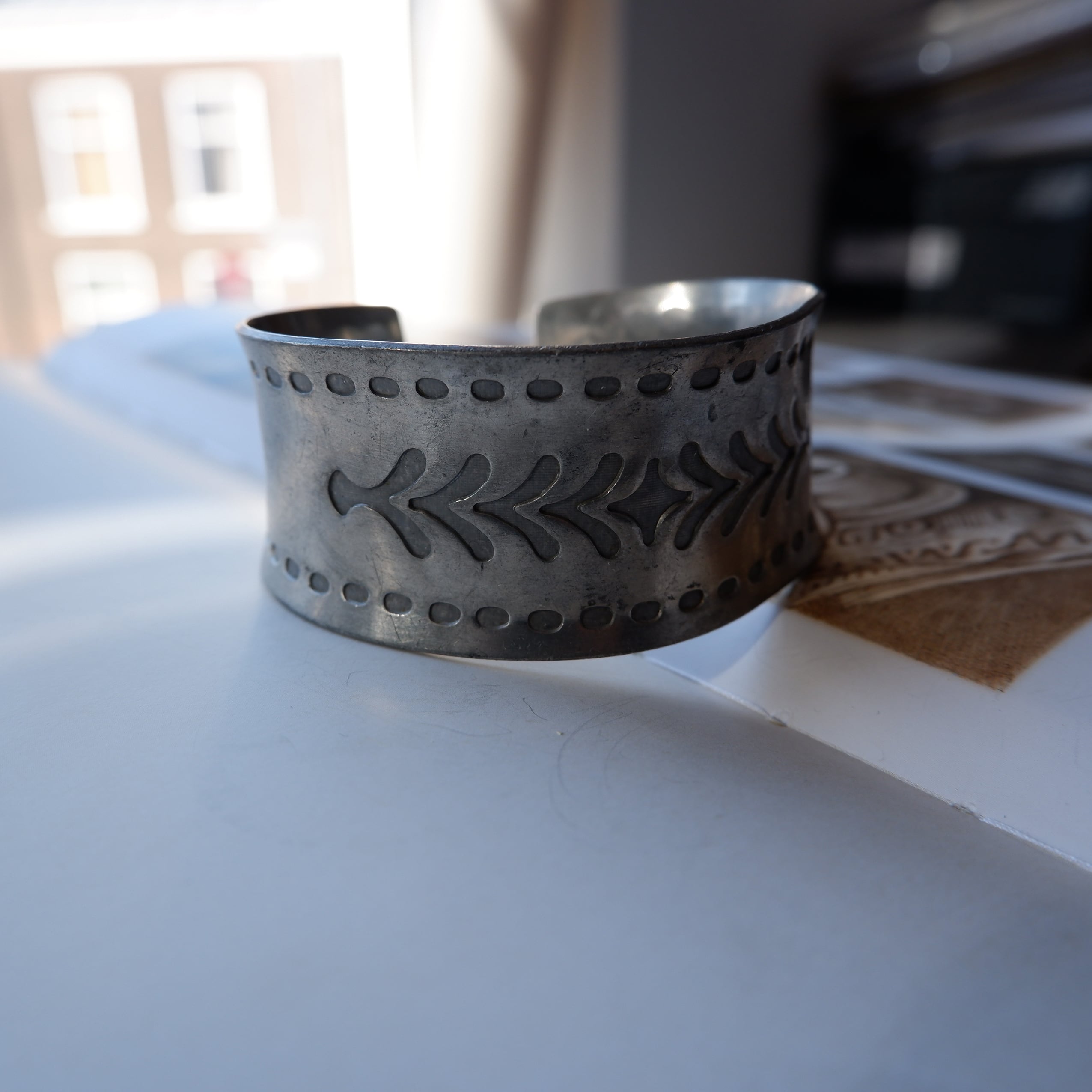 幅のあるデザインが印象的な、ピューター製のバングルです。