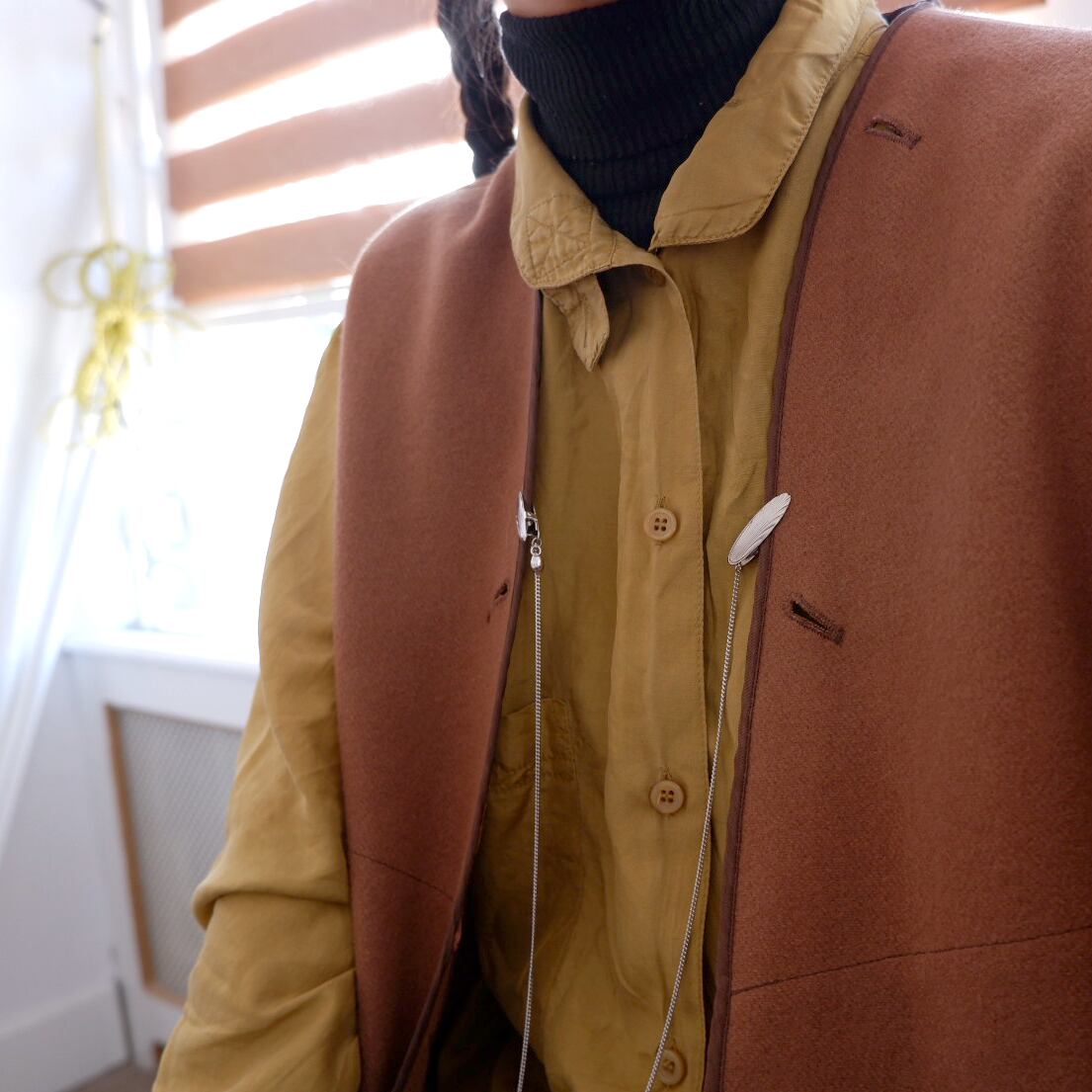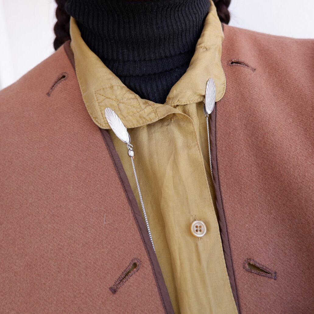 写真のように、ベストやカーディガンの開き、またはシャツの襟元などへ留めて、ロングネックレスのように楽しめます。