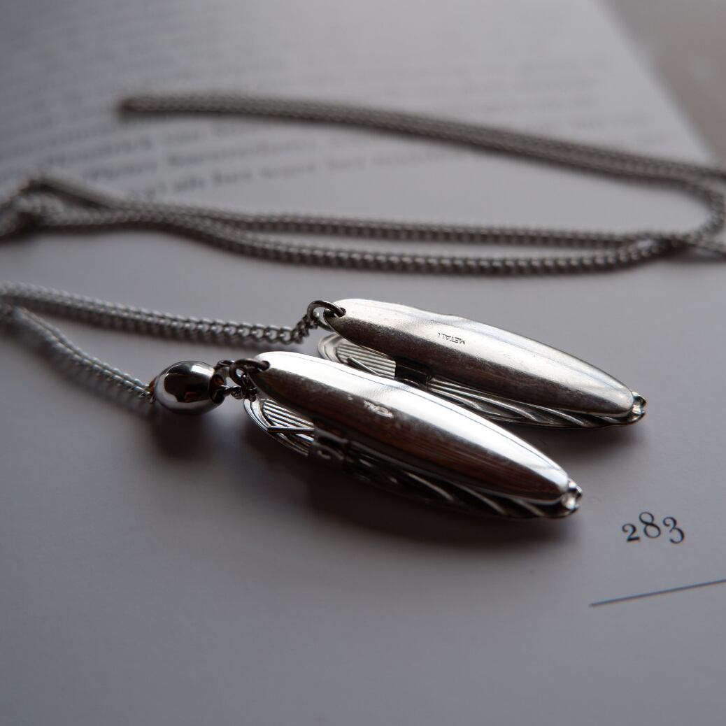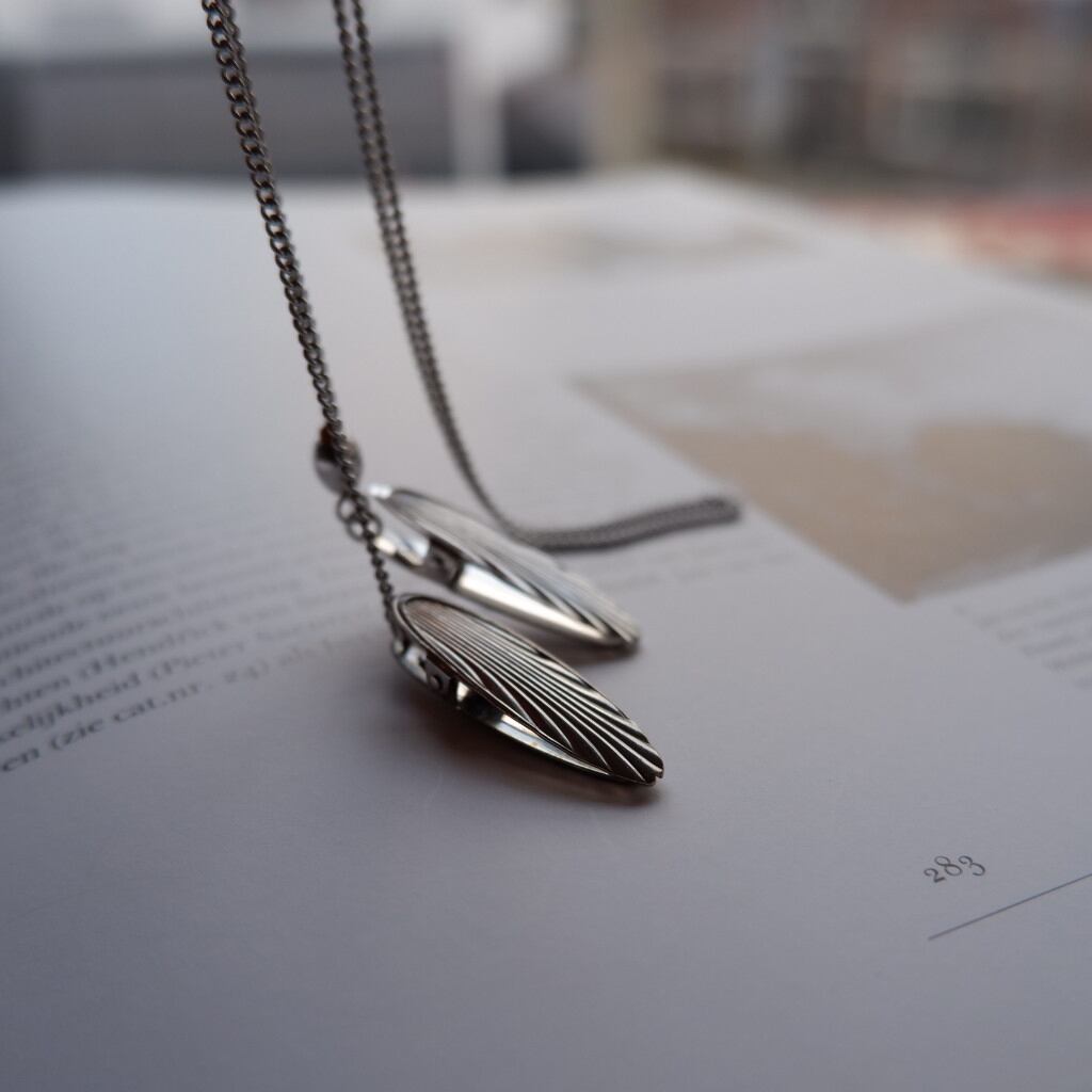 クリップには羽の模様が彫金されており、左右で留めると翼を広げたようなデザインに。