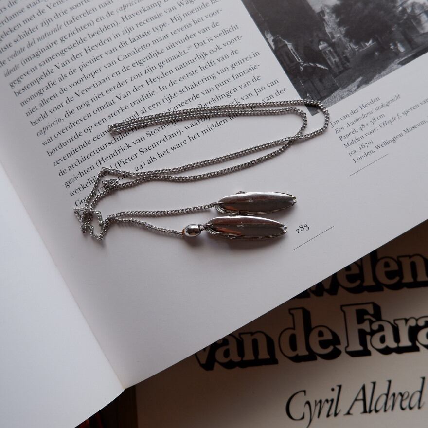 二つのクリップがチェーンでつながれた、変形デザインのブローチ/ネックレスです。