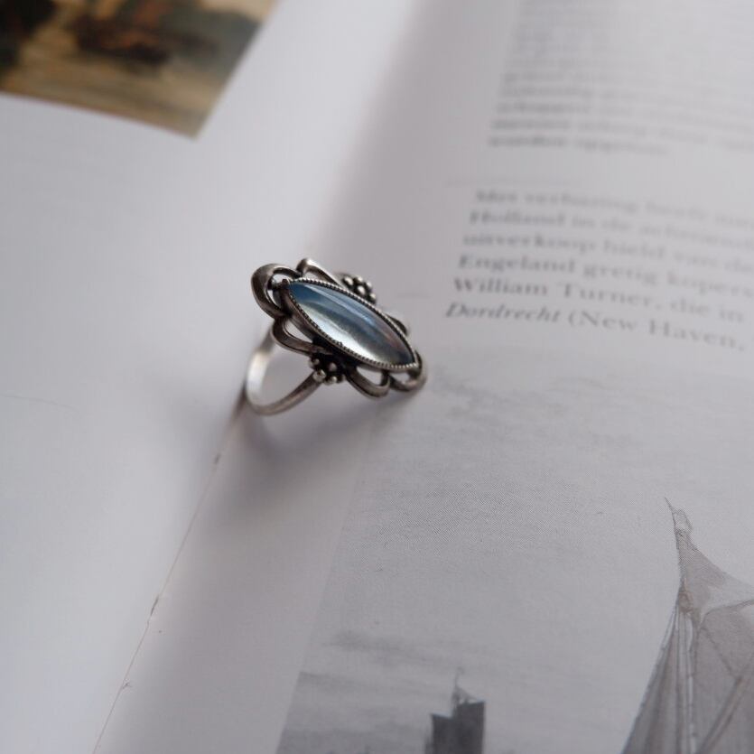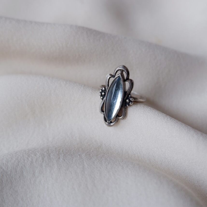 薄い水色のガラスモチーフが爽やかなシルバー製のヴィンテージリングです。