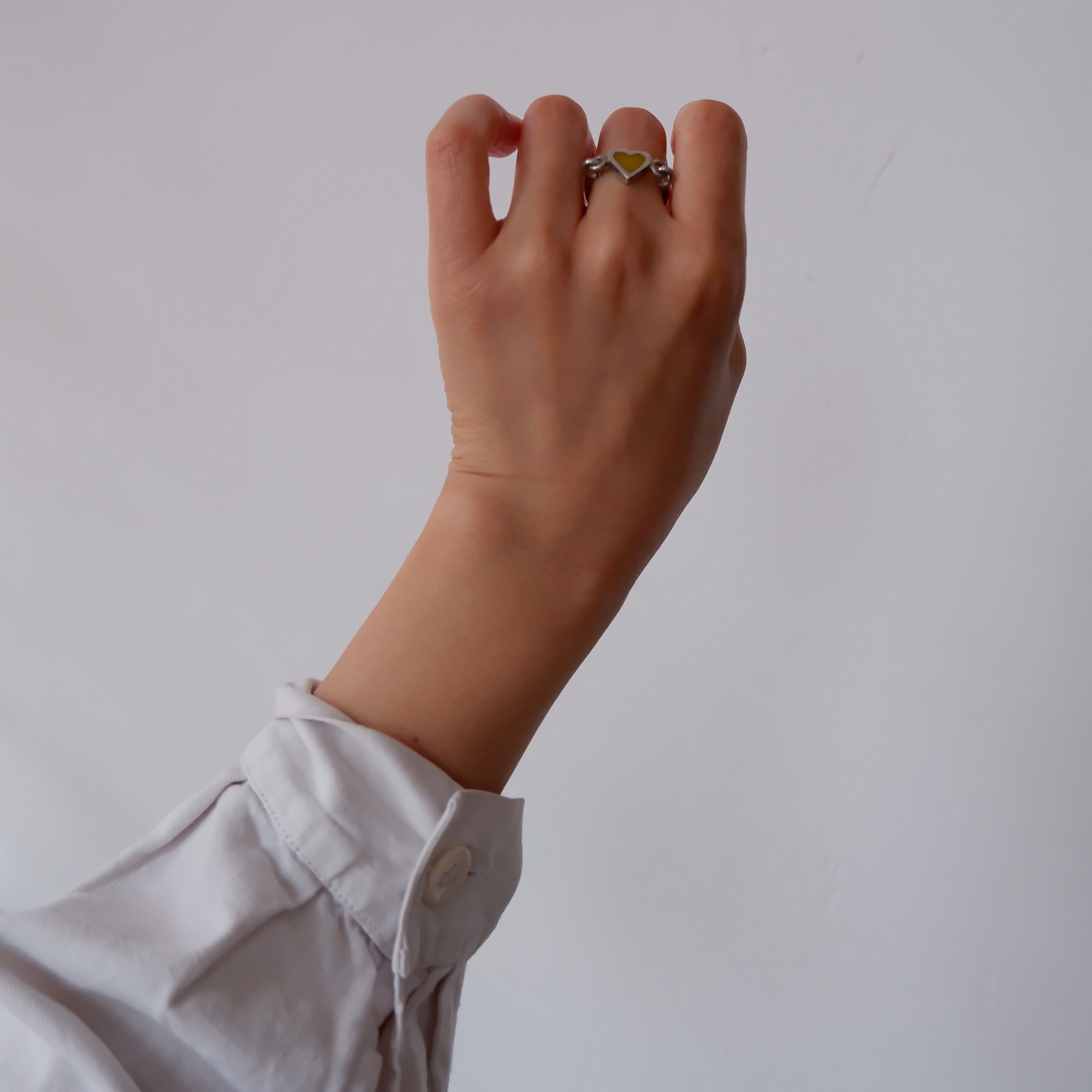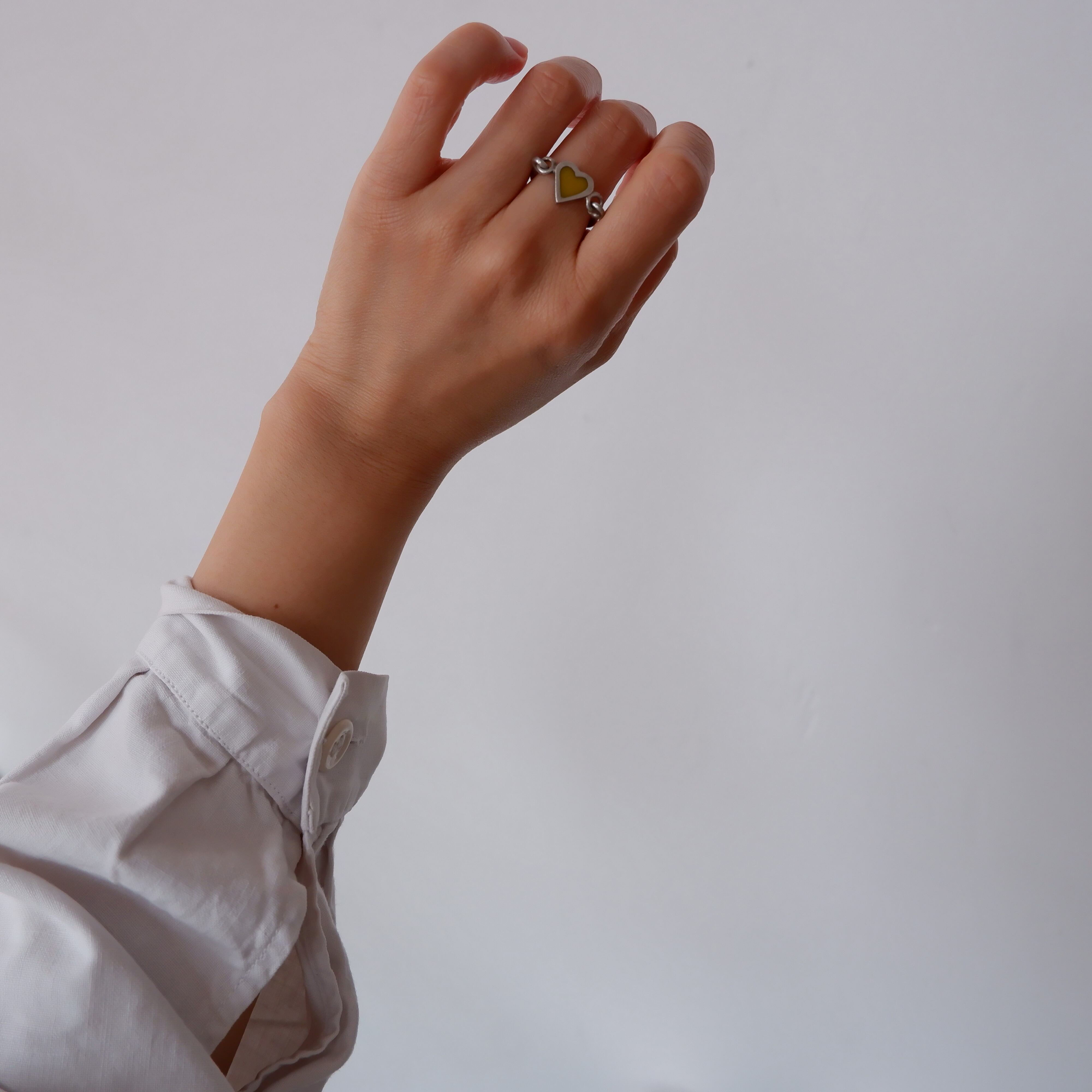 モチーフはハート。くすんだマスタード色との合わせが可愛い一品です。