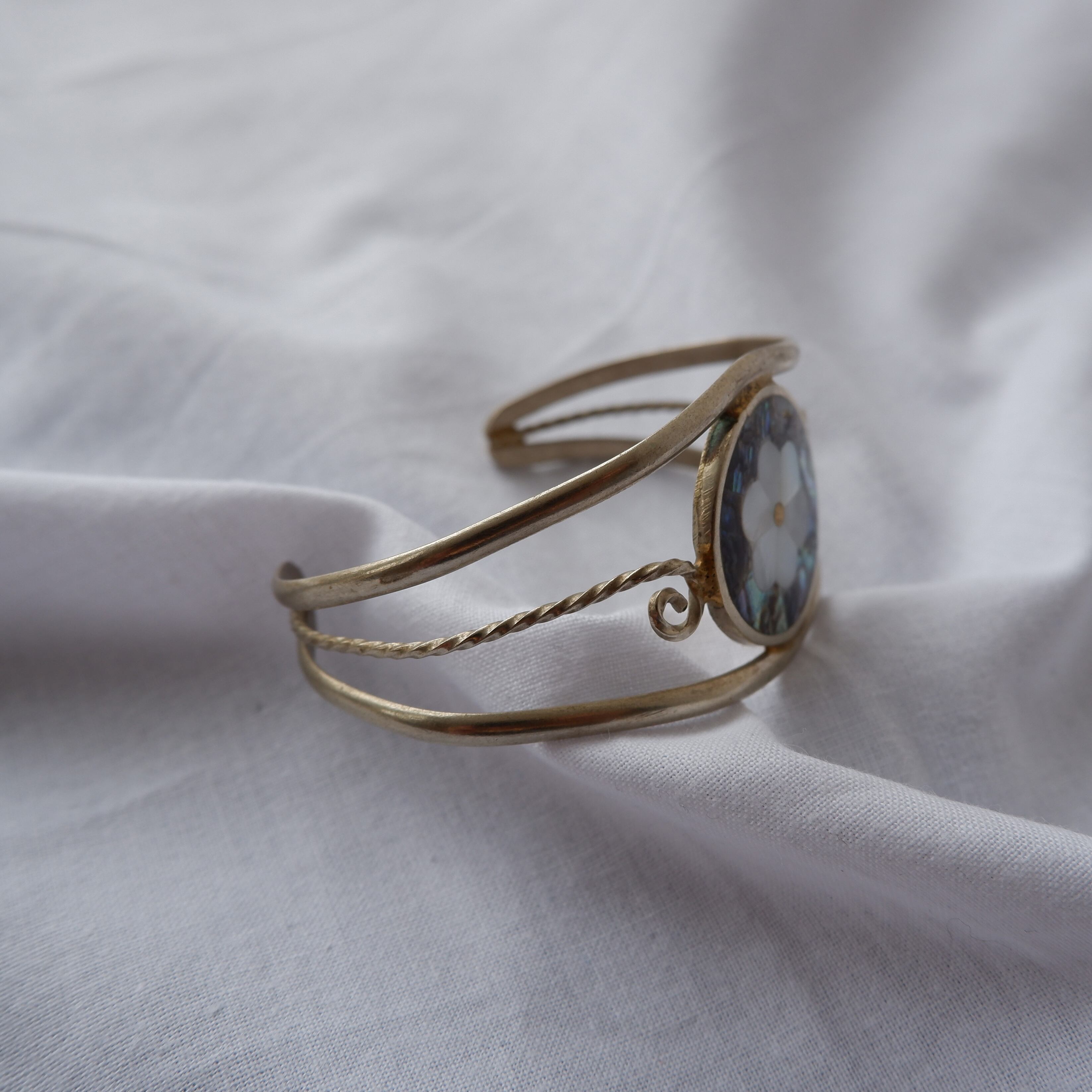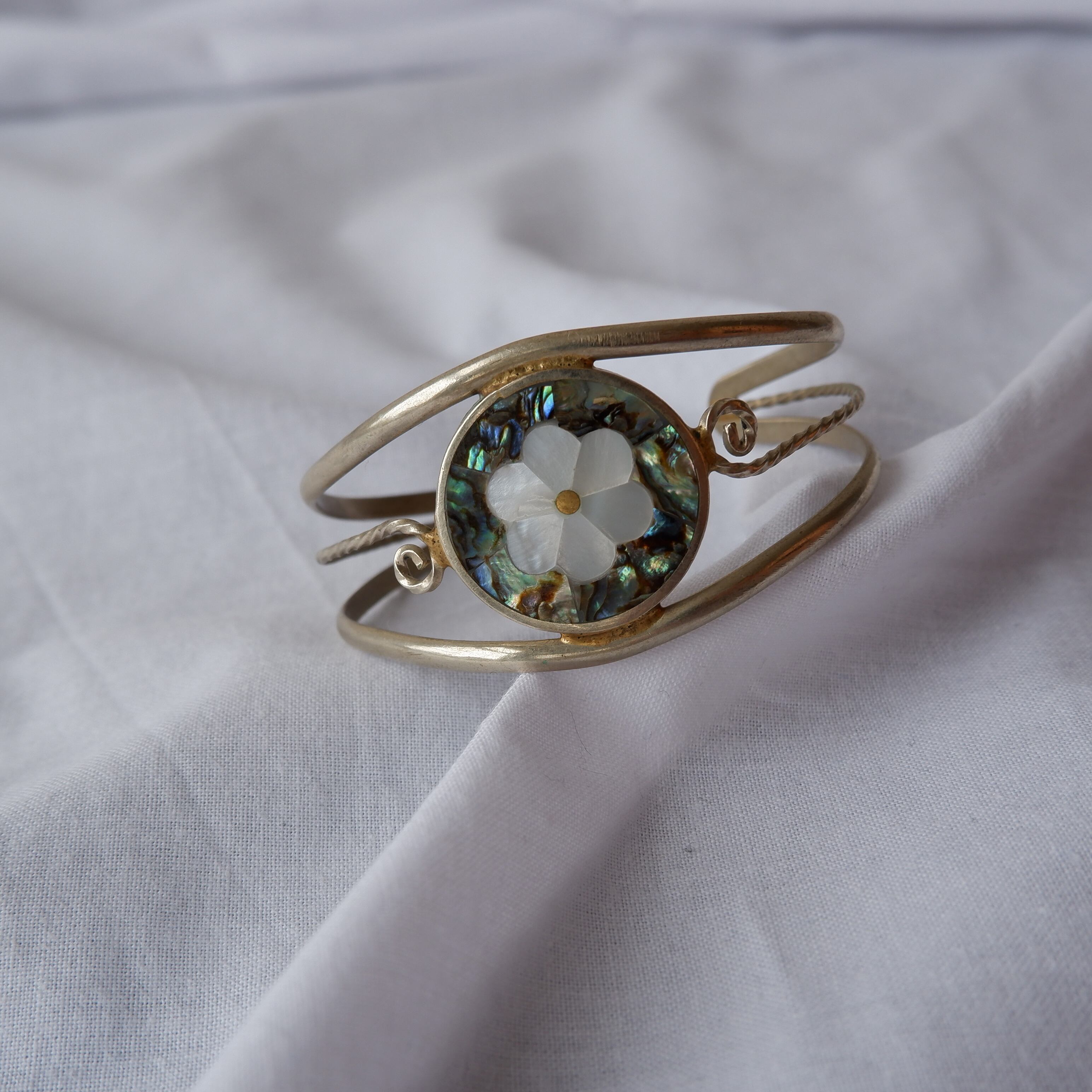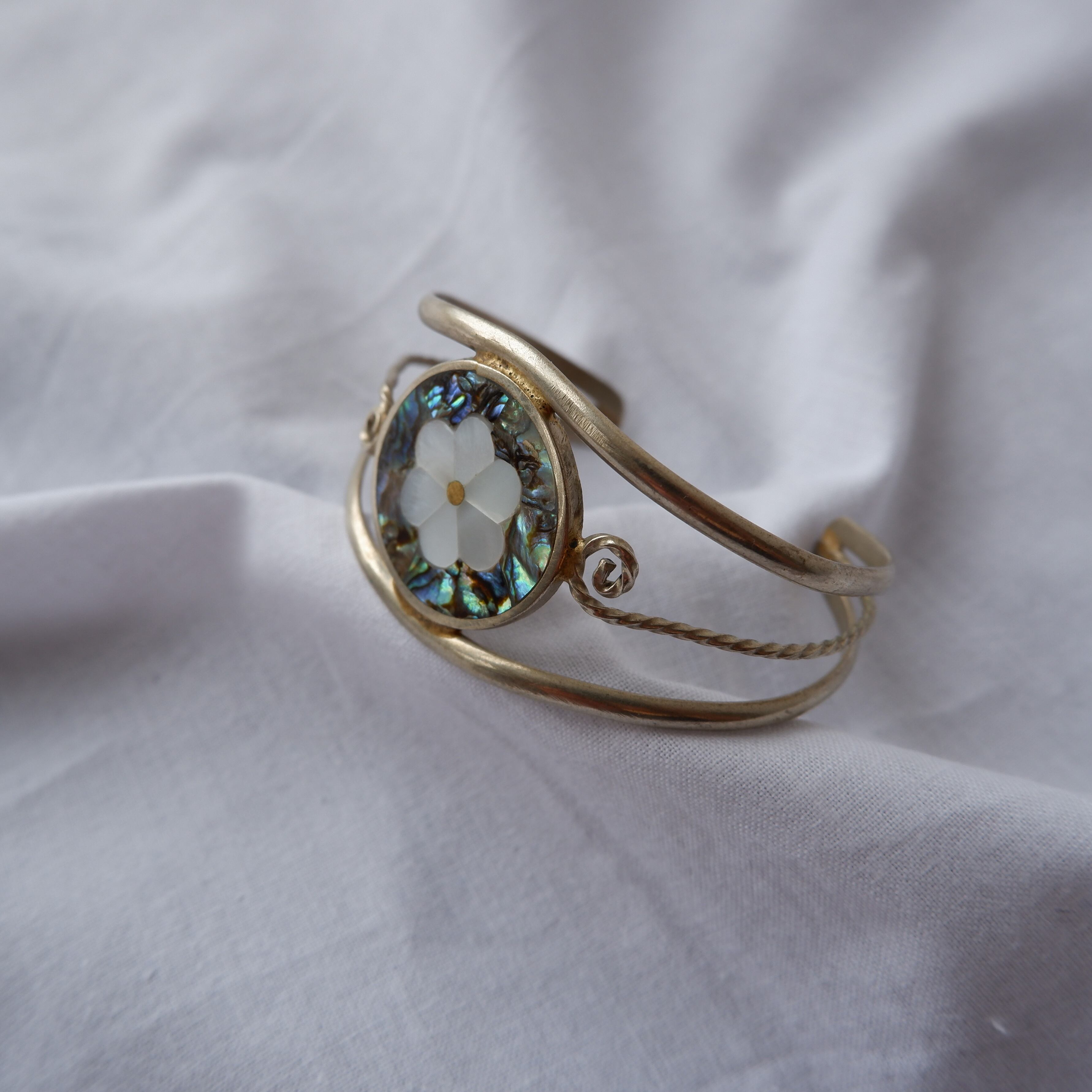 天然貝のモチーフが印象的な、メタル製のヴィンテージバングルです。