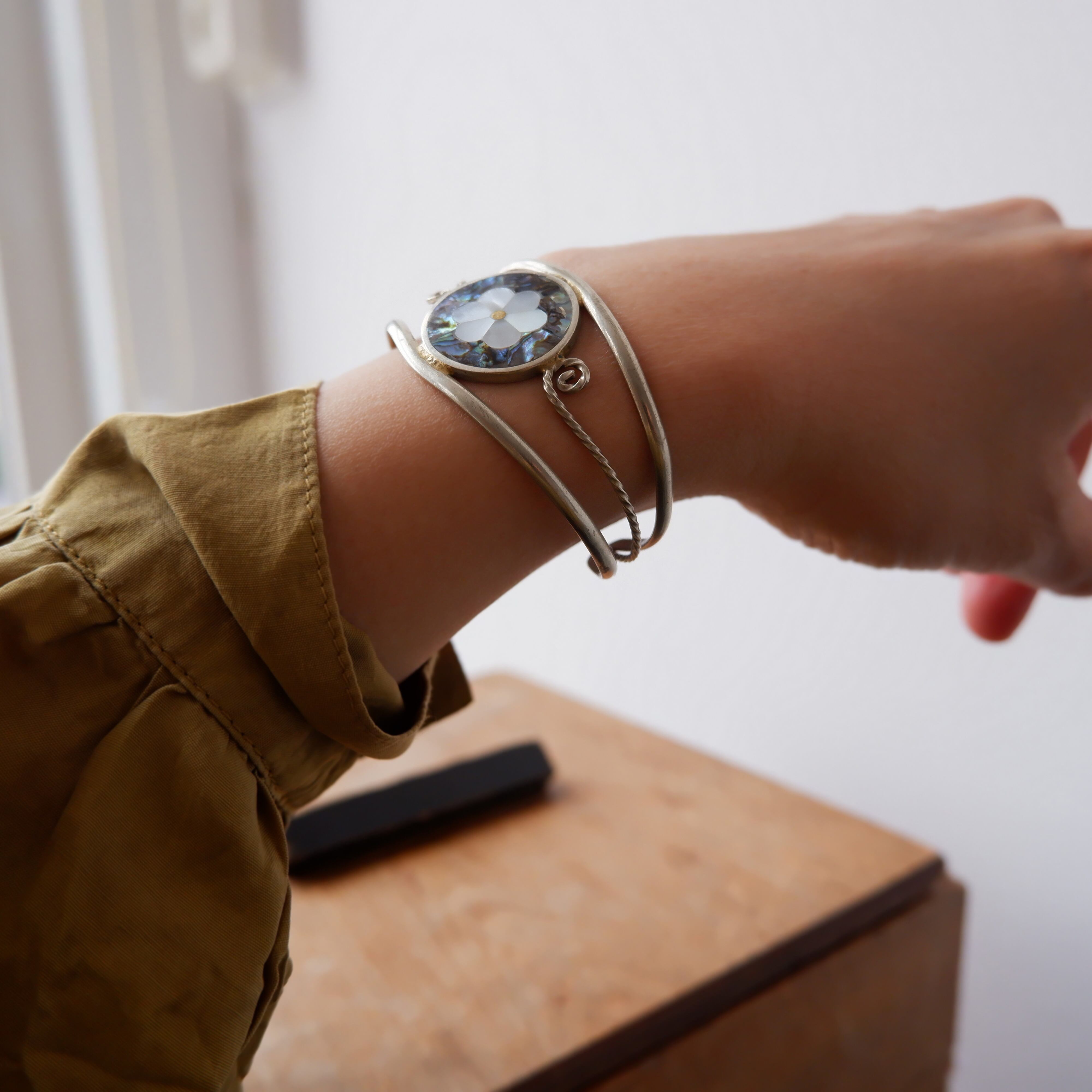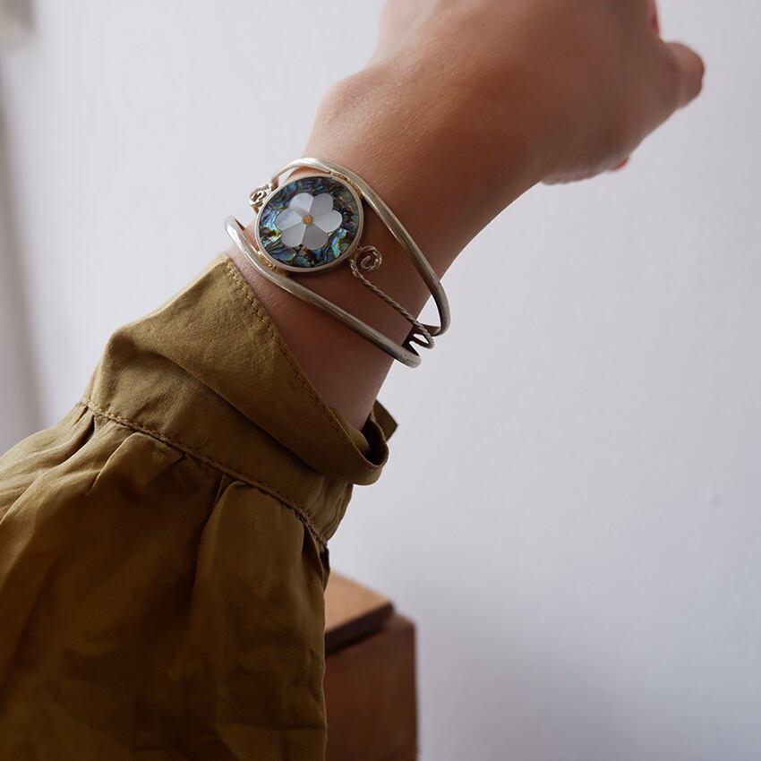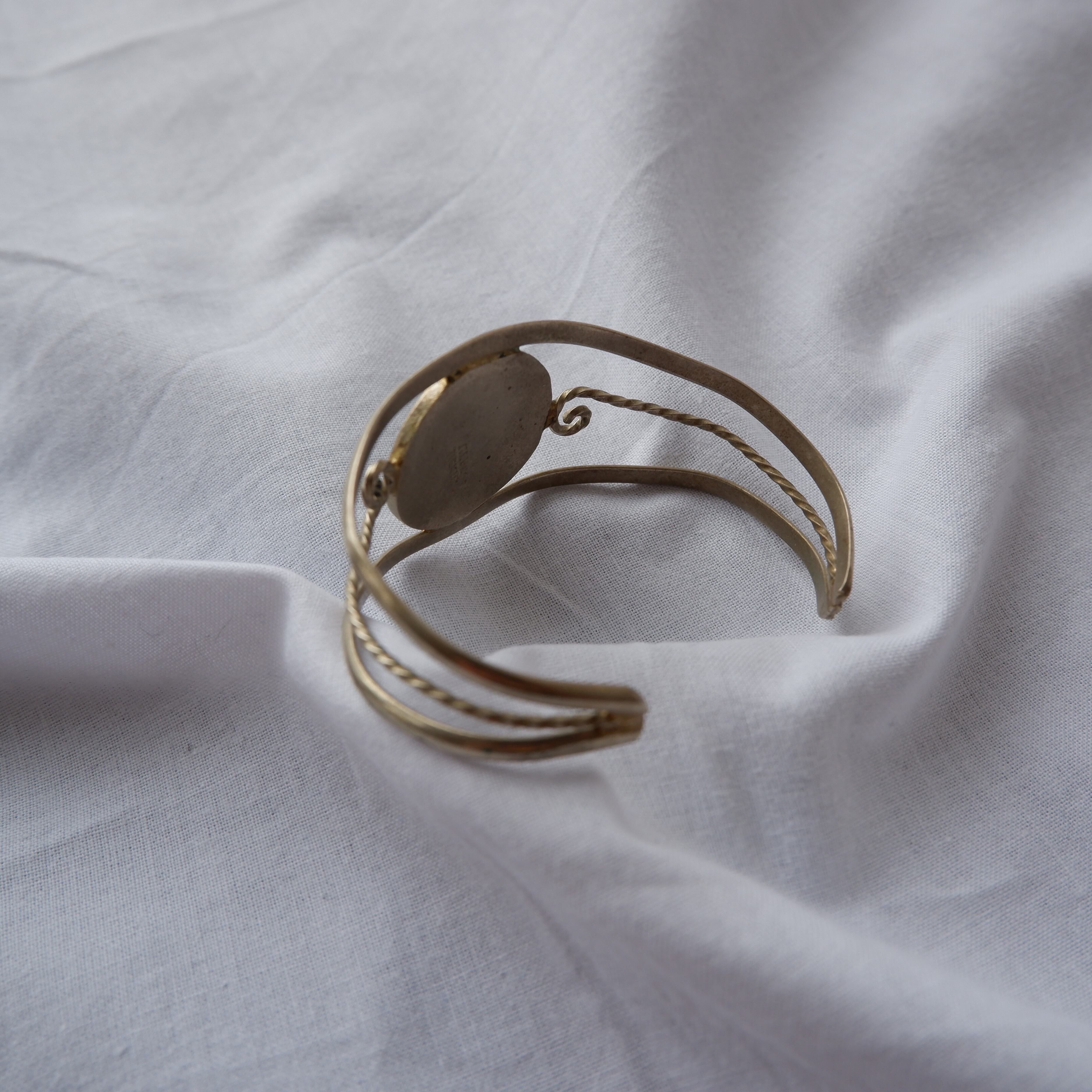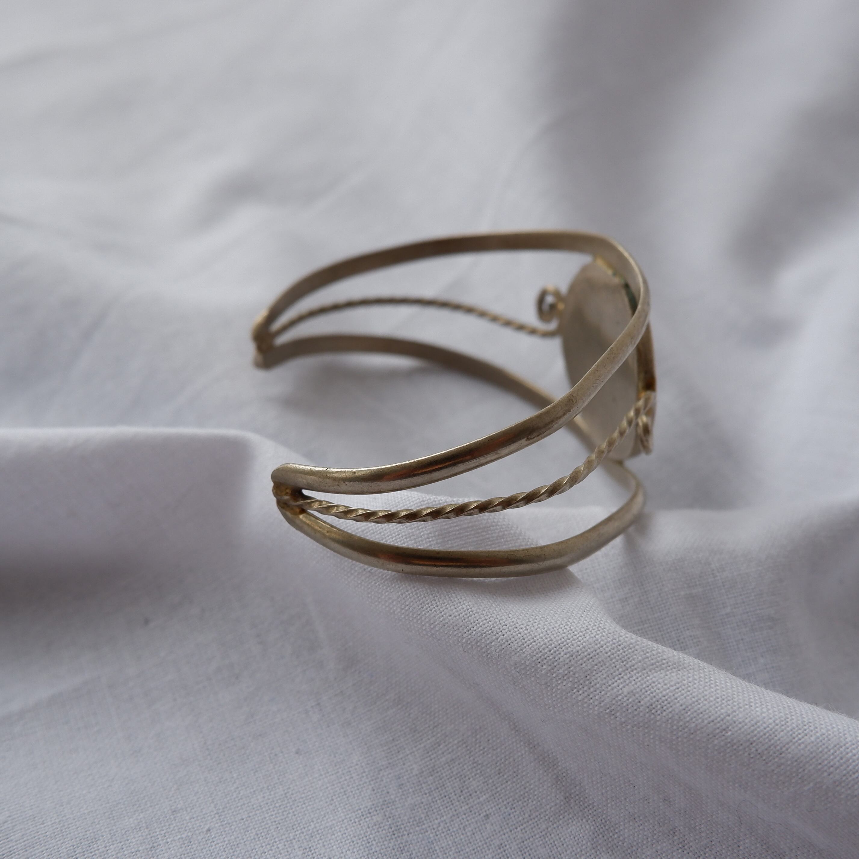 天然貝のモチーフが印象的な、メタル製のヴィンテージバングルです。