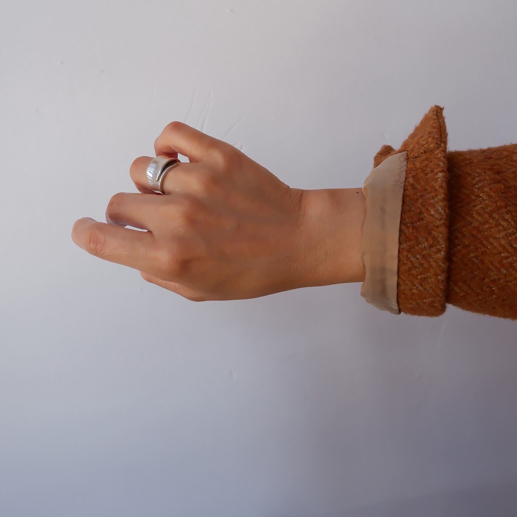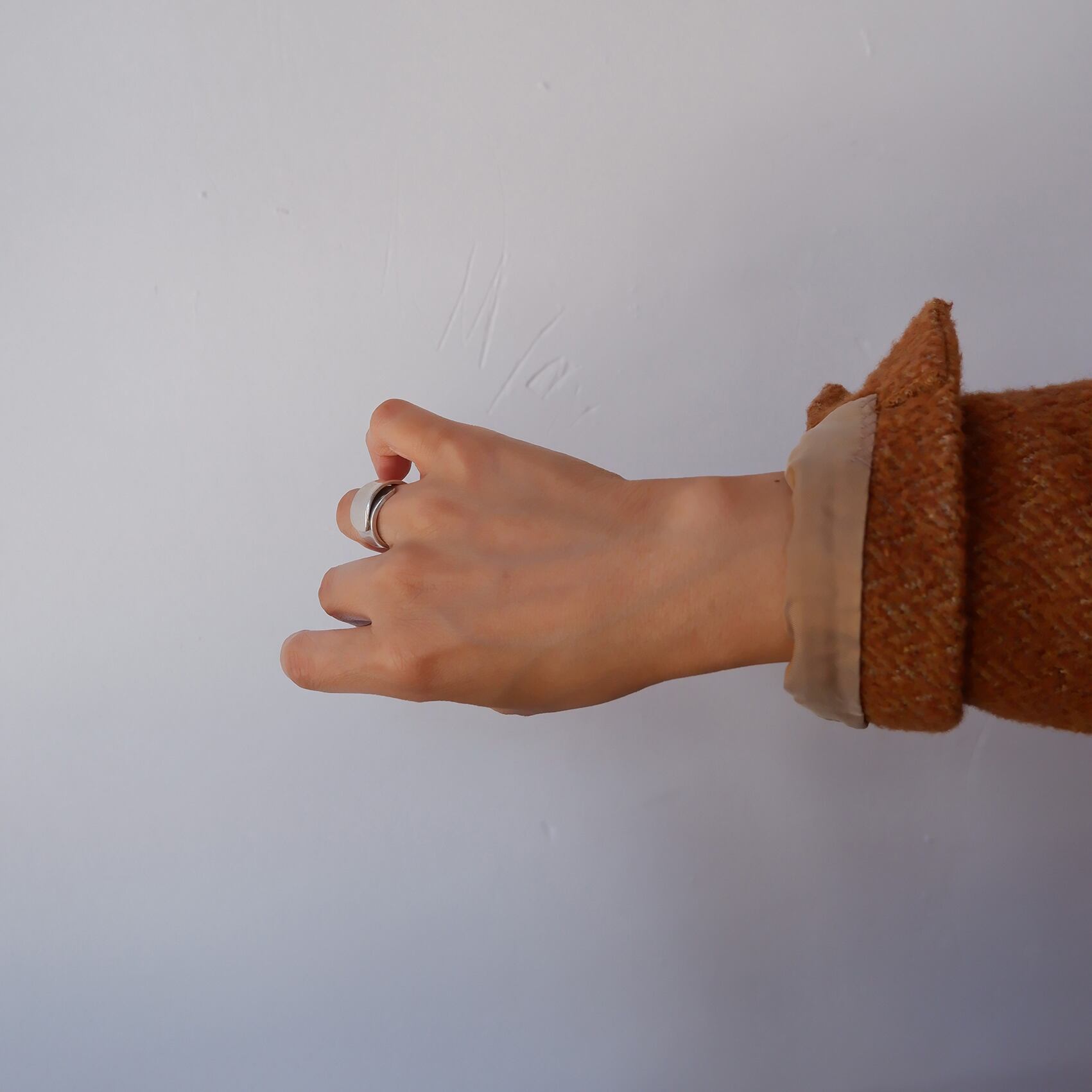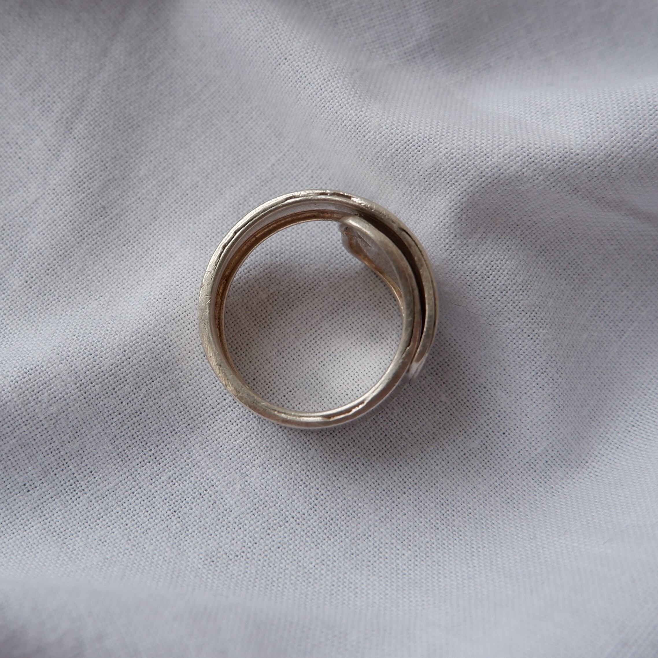 指にリングが抱き着いているような、ユニークなデザインが印象的な一品です。
