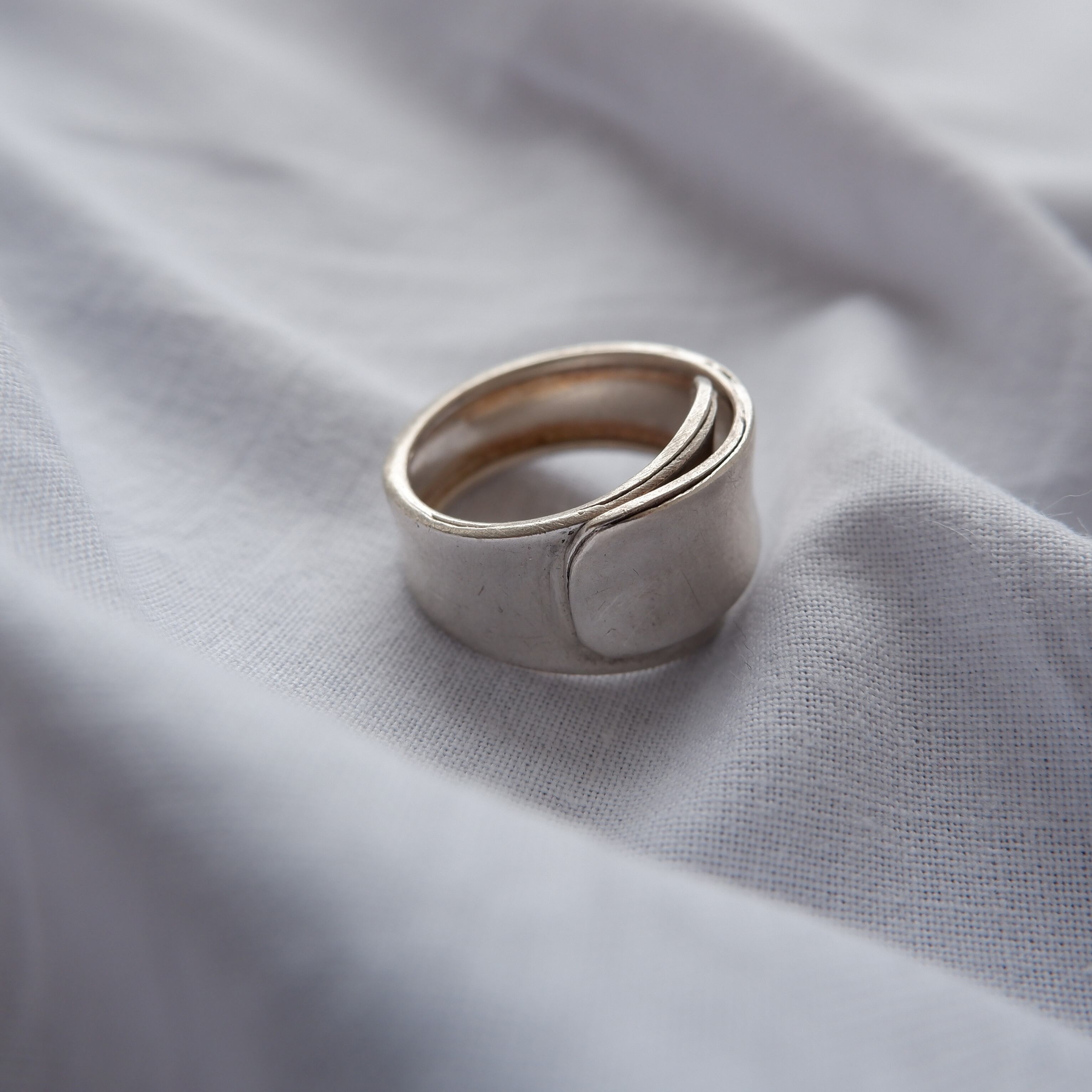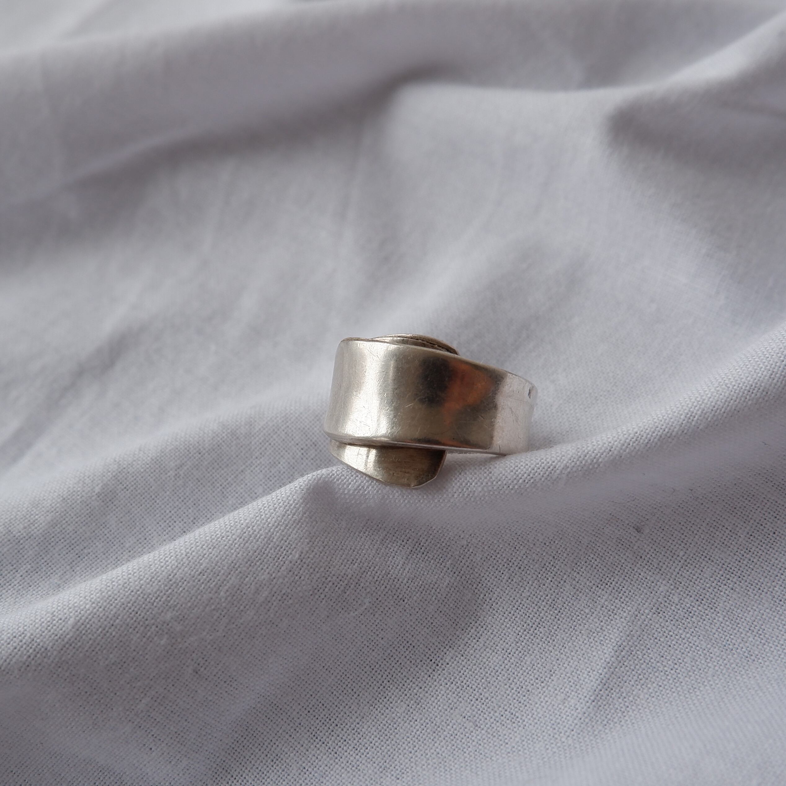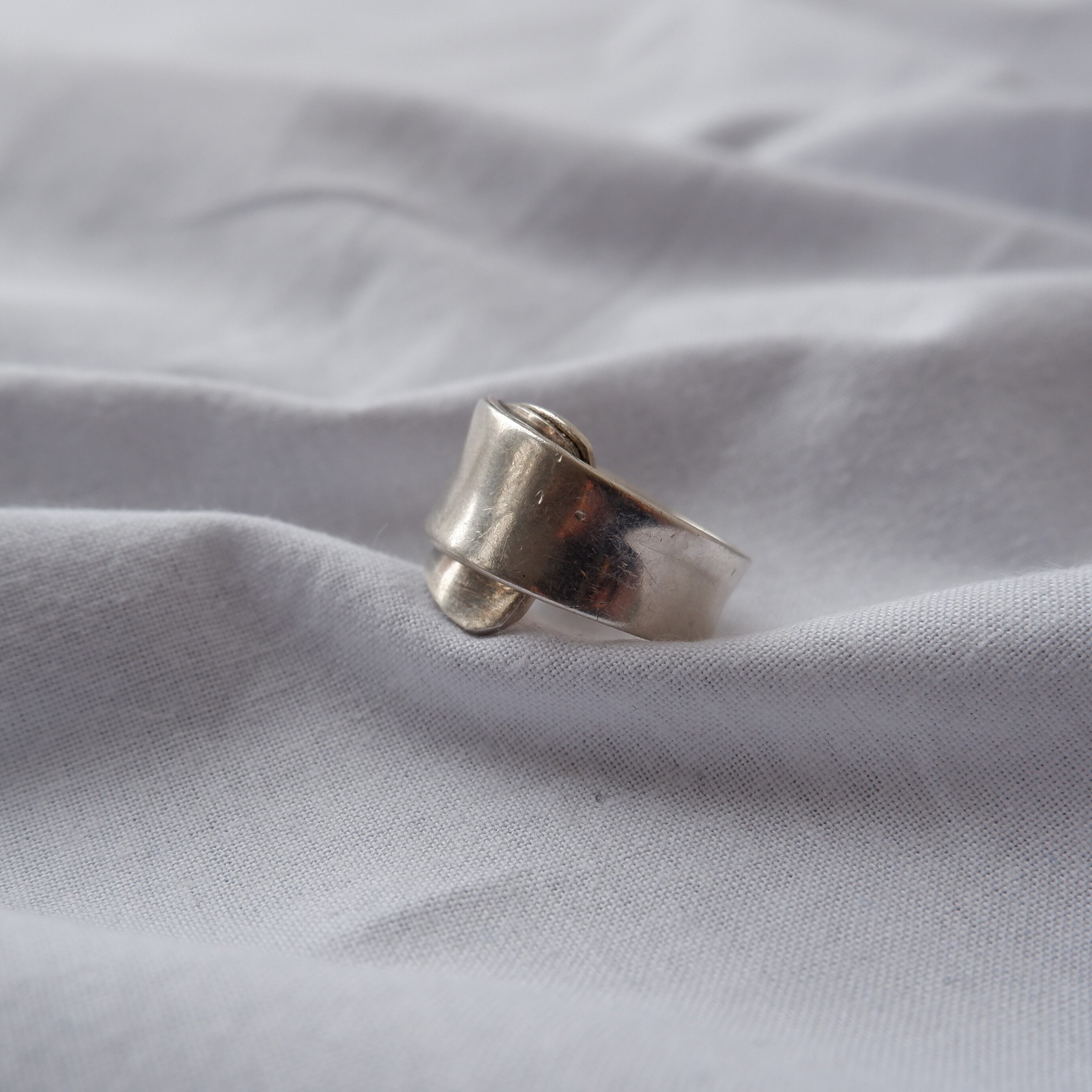 指にリングが抱き着いているような、ユニークなデザインが印象的な一品です。